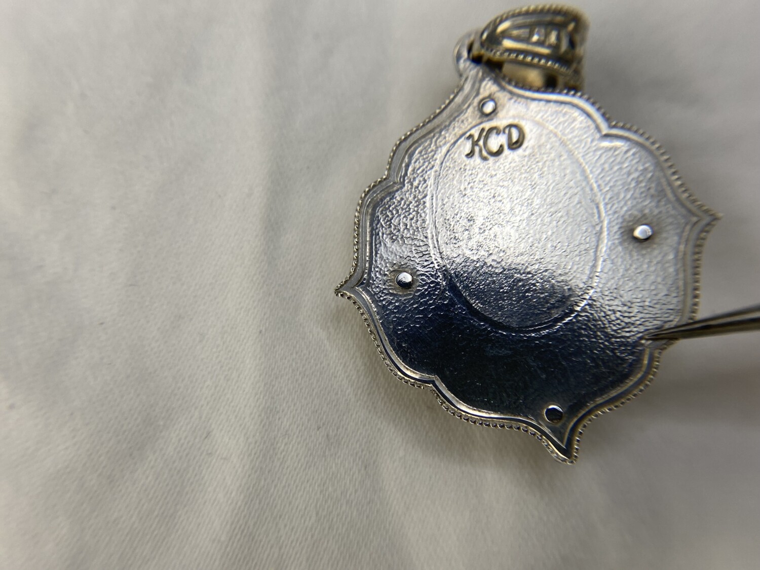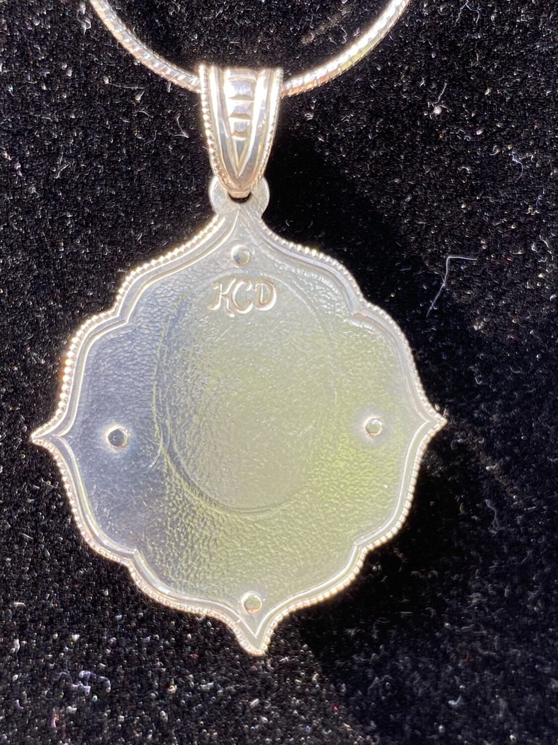 The back of the pendant is textured with hundreds of tiny hammer marks to strengthen the fine silver and engraved with my initials. There is space for a custom engraving or design upon request for an additional charge.