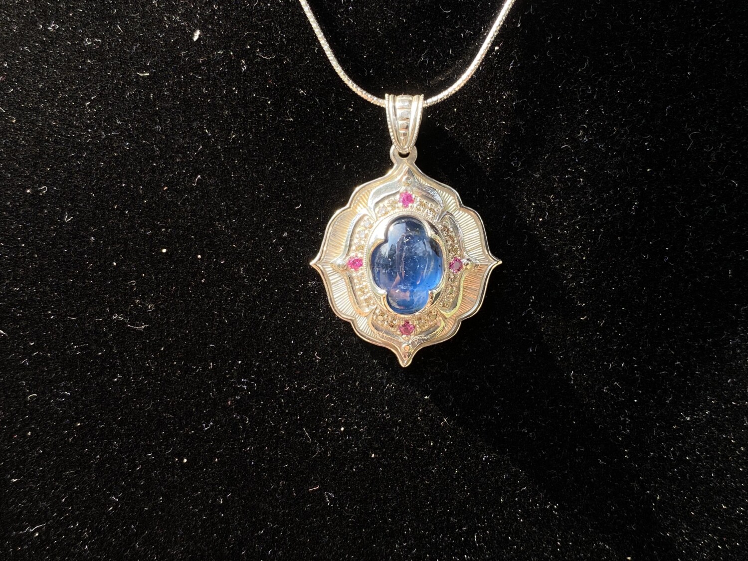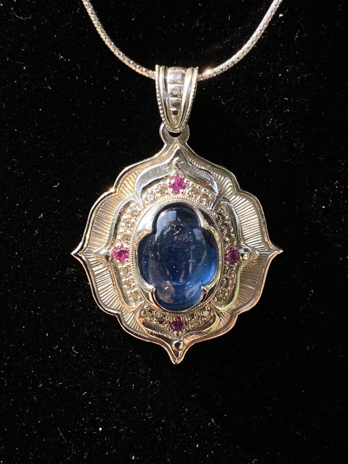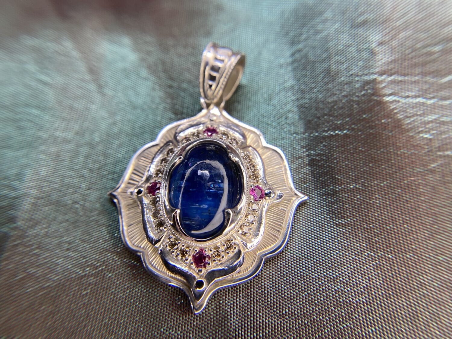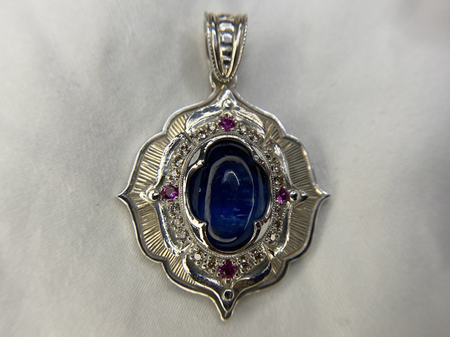 This hand-sculpted pendant is crafted from work-hardened fine silver. Made in two parts and riveted together, it securely “sandwiches” a lozenge-shaped Kyanite gemstone at its center. Surrounding the stone is a halo of twenty natural champagne-colored diamonds, complemented by four vivid pink sapphires—one set in each petal. All bead settings, bright cuts, and fabrication were done entirely by hand in my studio.