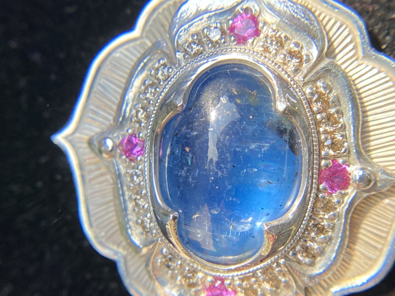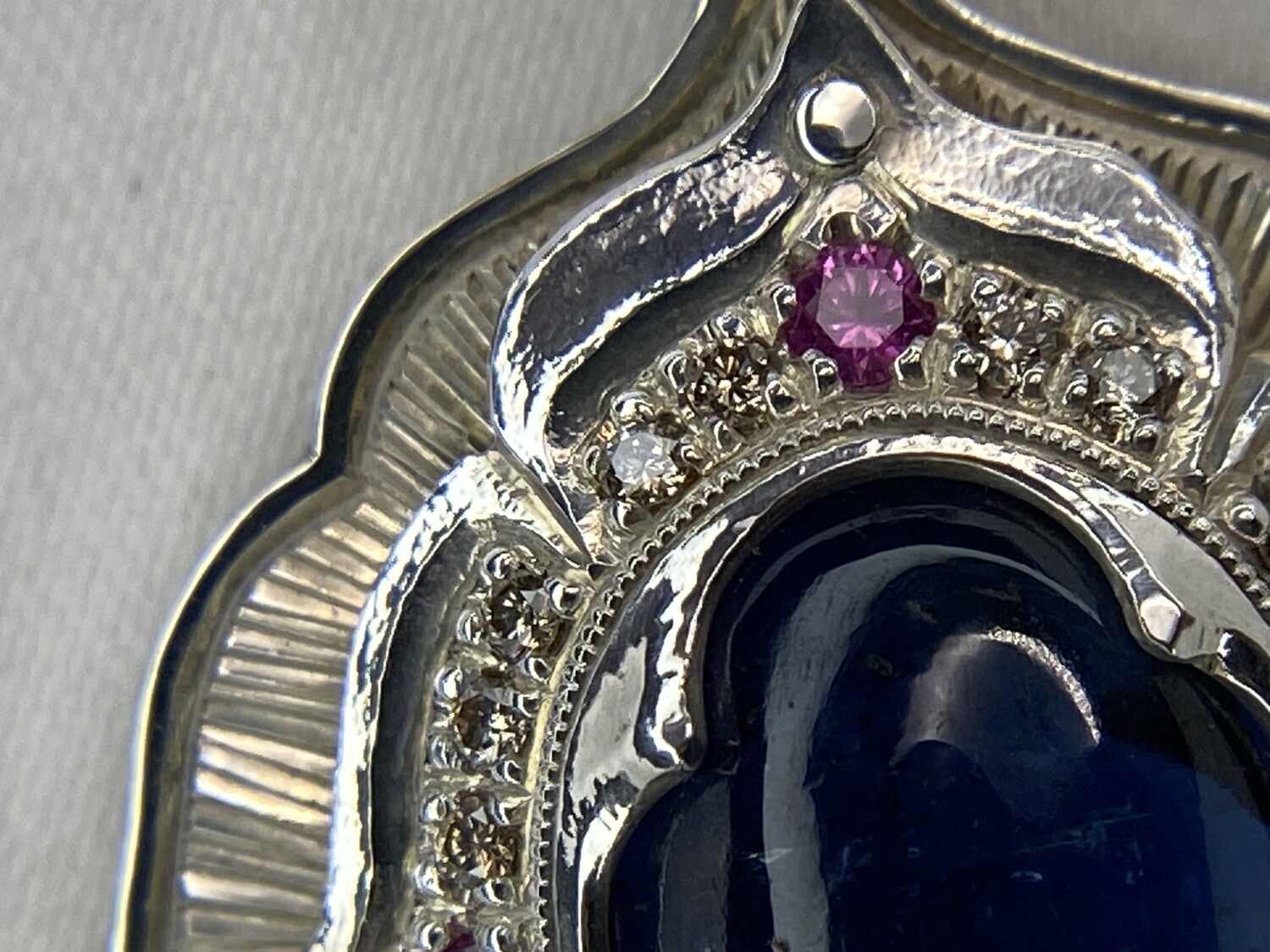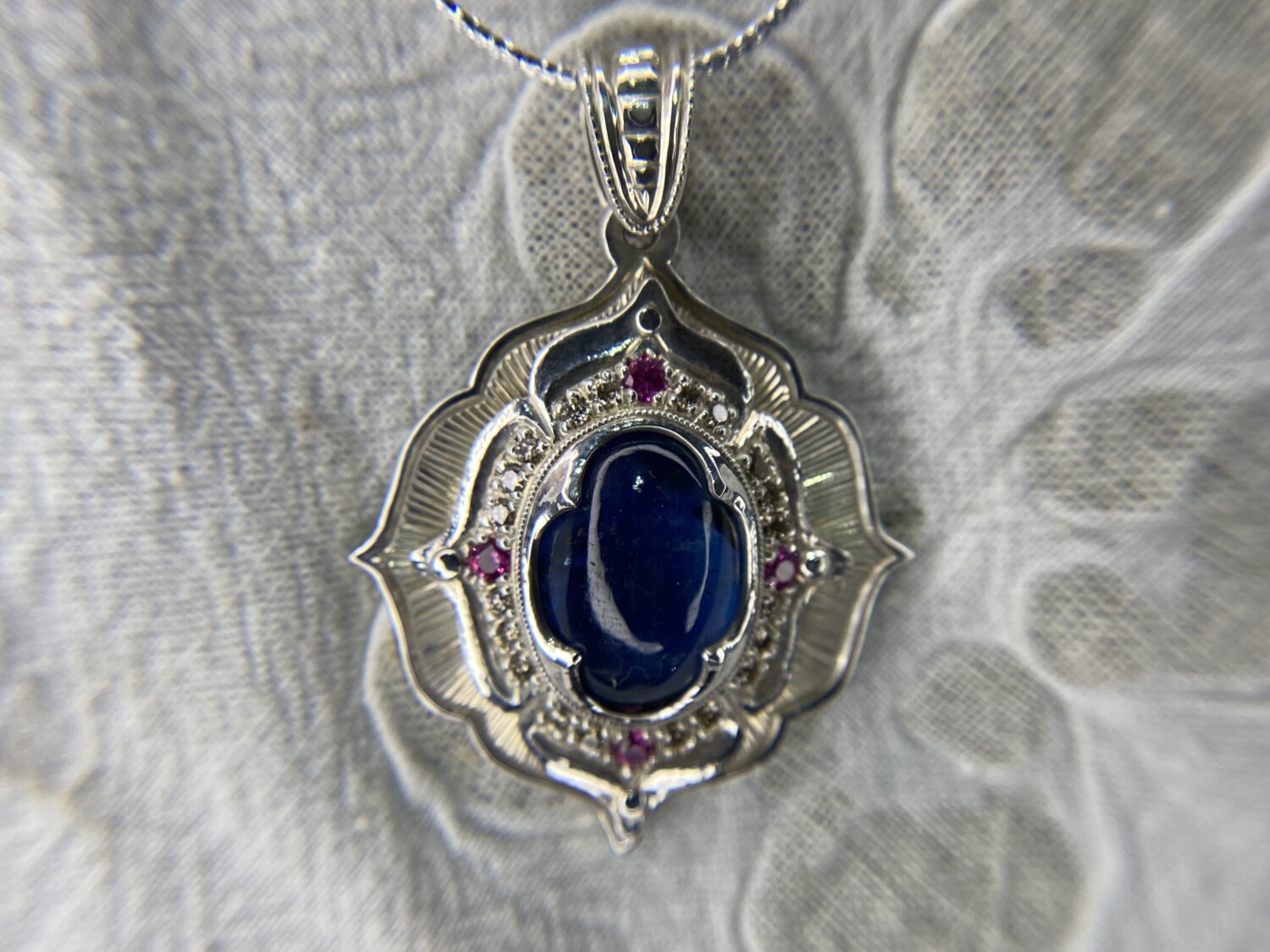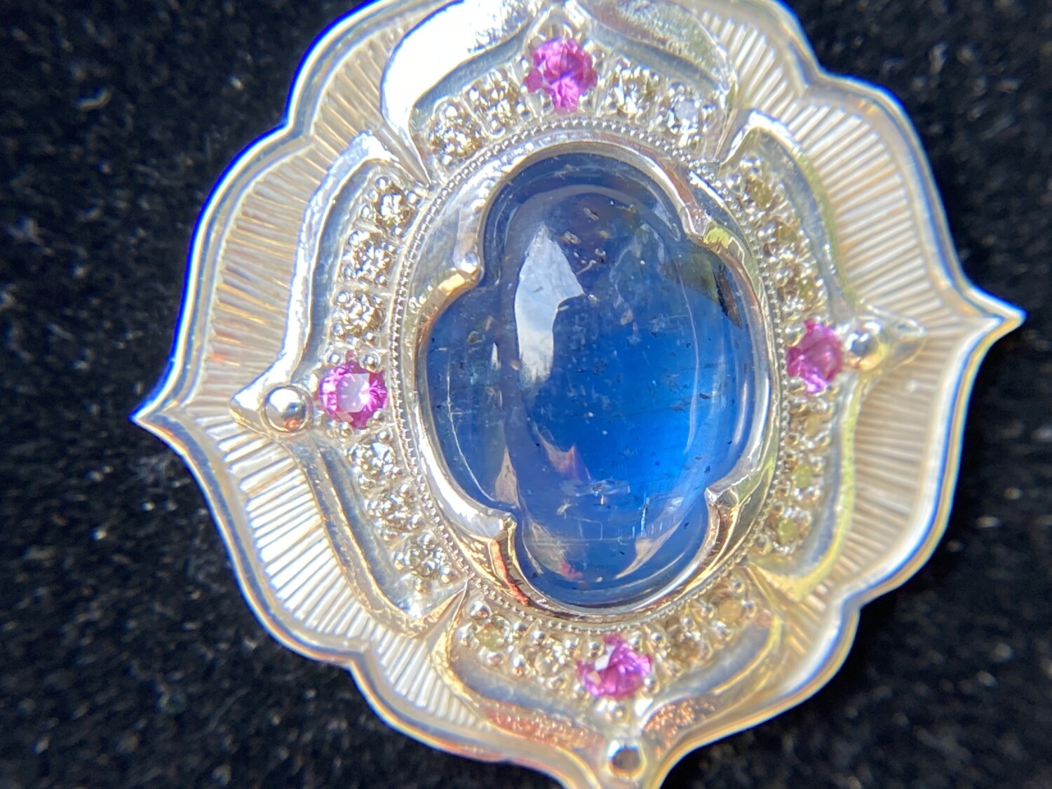 This hand-sculpted pendant is crafted from work-hardened fine silver. Made in two parts and riveted together, it securely “sandwiches” a lozenge-shaped Kyanite gemstone at its center. Surrounding the stone is a halo of twenty natural champagne-colored diamonds, complemented by four vivid pink sapphires—one set in each petal. All bead settings, bright cuts, and fabrication were done entirely by hand in my studio.